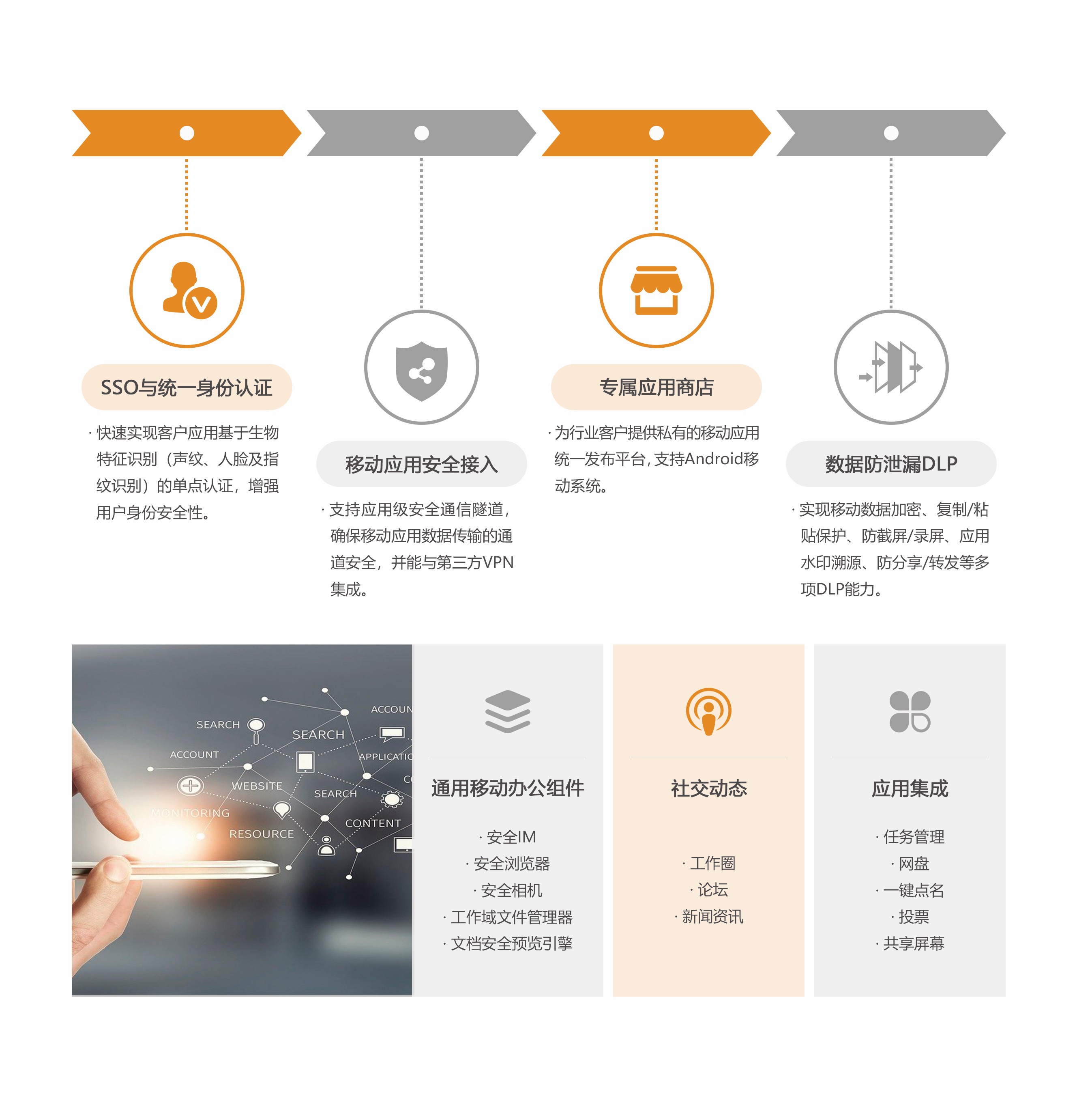 統(tǒng)一移動(dòng)安全門戶客戶端軟件(APP)方便用戶通過移動(dòng)智能設(shè)備安全地接入內(nèi)部業(yè)務(wù),隨時(shí)隨地處理工作事務(wù)、訪問內(nèi)部資源;提供開發(fā)者門戶服務(wù),方便應(yīng)用的維護(hù)與管理,為所有業(yè)務(wù)應(yīng)用提供豐富的管理能力和輕量級(jí)的服務(wù)入口,使資源利用更高效、更便捷。