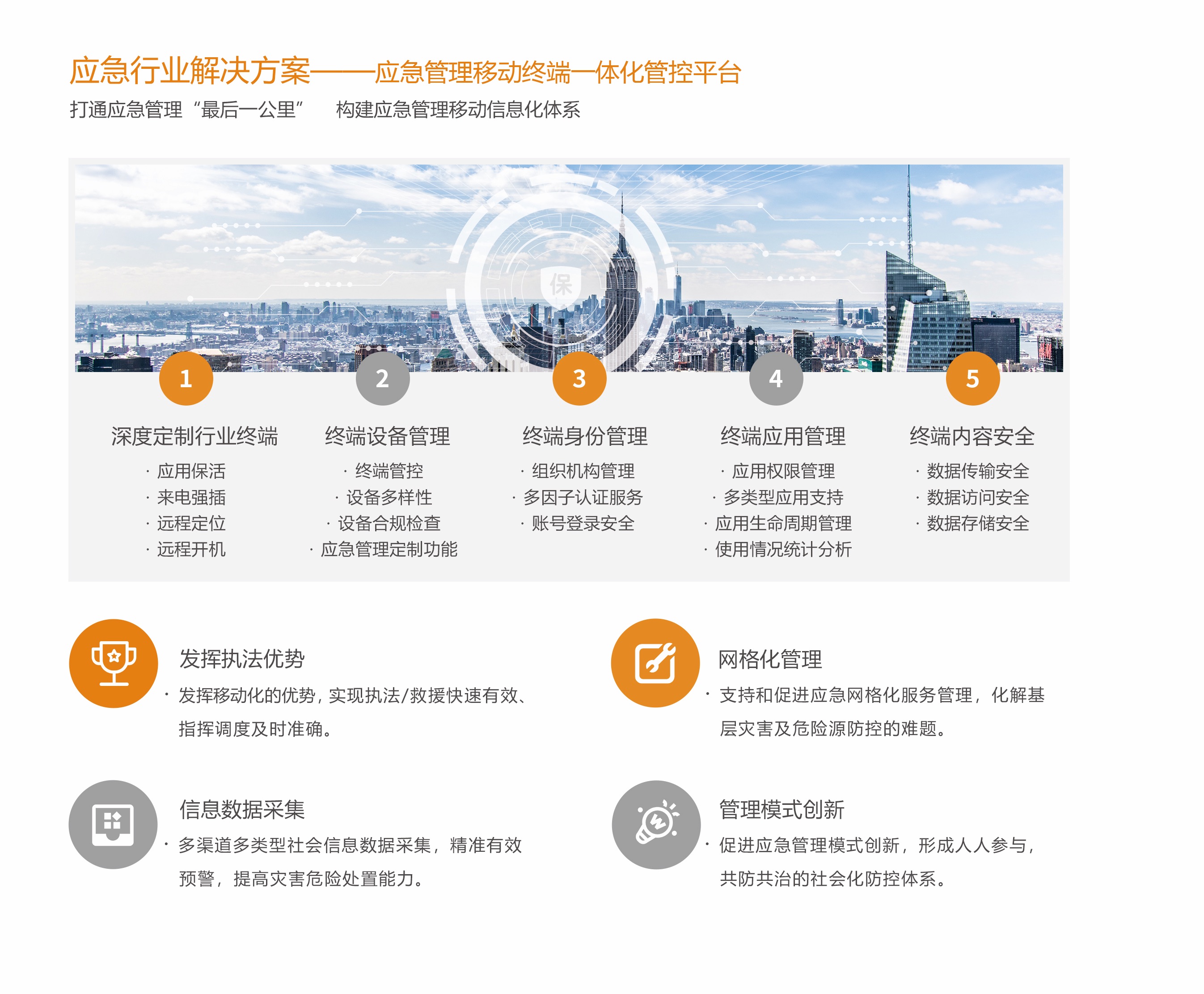 我司以聚焦提高應急管理廳科學化、專業化、智能化、精細化水平為目標,積極探索現代“智”理的信息化解決方案,并基于“云、管、端、群”理念設計了“應急管理移動終端一體化管控平臺”和“智慧化工園區安全管控平臺”。以信息化推進應急管理現代化,強化實戰導向和“智慧應急”牽引,規劃引領、集約發展、統籌建設、扁平應用,夯實信息化發展基礎,補齊網絡、數據、安全、標準等方面的短板弱項,推動形成體系完備、層次清晰、技術先進的應急管理信息化體系,全面提升監測預警、監管執法、輔助指揮決策、救援實戰和社會動員能力。